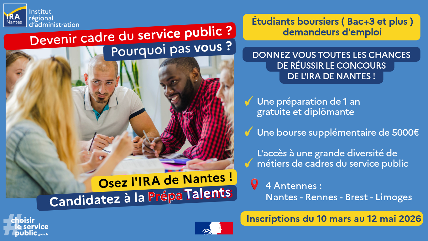 La classe Prépa Talents de l’IRA de Nantes s’inscrit dans le plan « Talents du service public« , annoncé par le Président de la République lors de sa venue à l’IRA de Nantes le 11 février 2021.